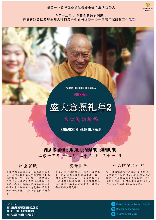 为了加强我们对上师的孝心,Kadam Choeling Indonesia邀请大家一起来累积资粮就在盛大意愿礼拜2,二零一五年十二月二十三至三十一日,地点在Villa Istana Bunga, Lembang, Bandung.