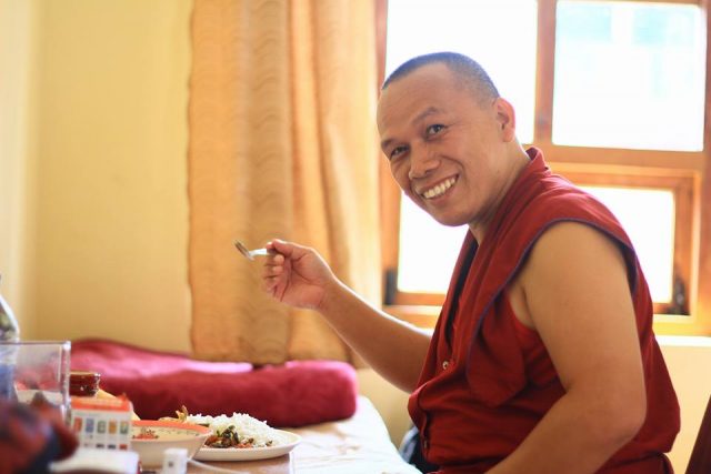 Foto: YM. Lobsang Jinpa sedang menikmati makan siang. Tidak lupa untuk mempersembahkan makanan atau minuman pertama kali kepada Sang Triratna.