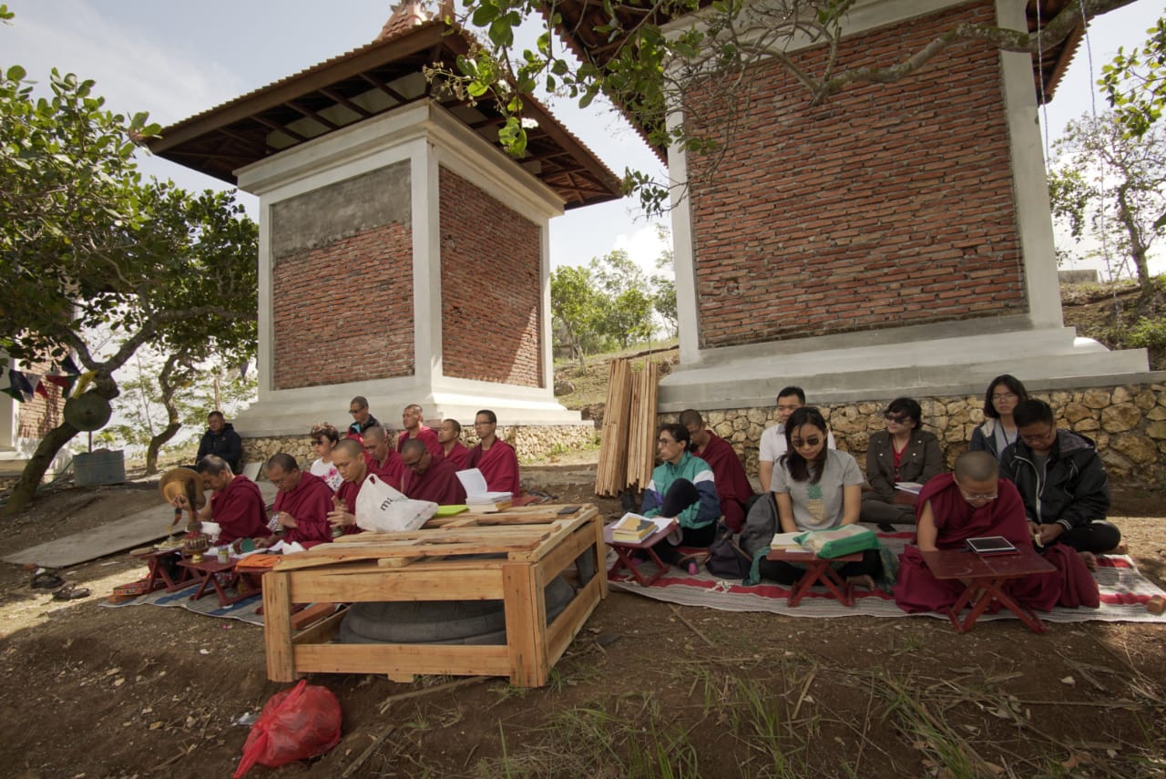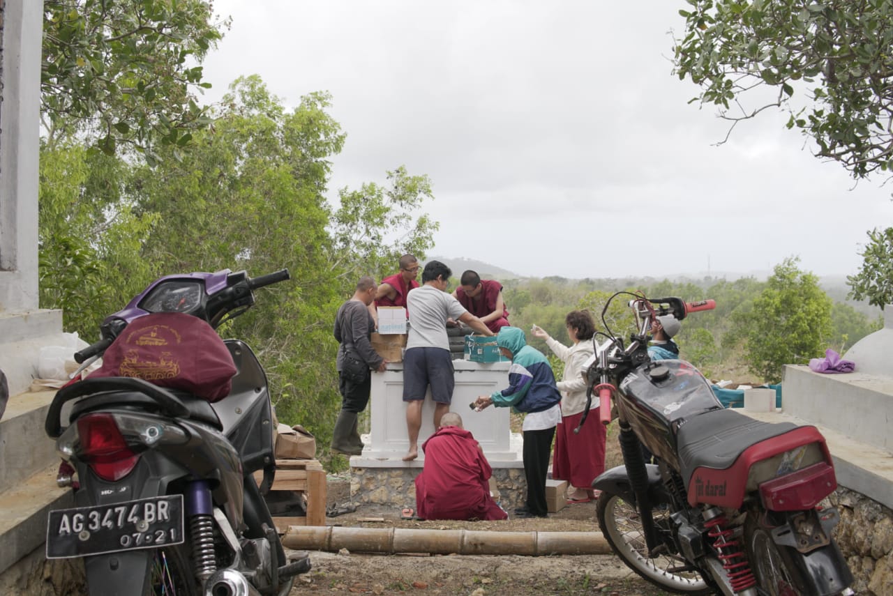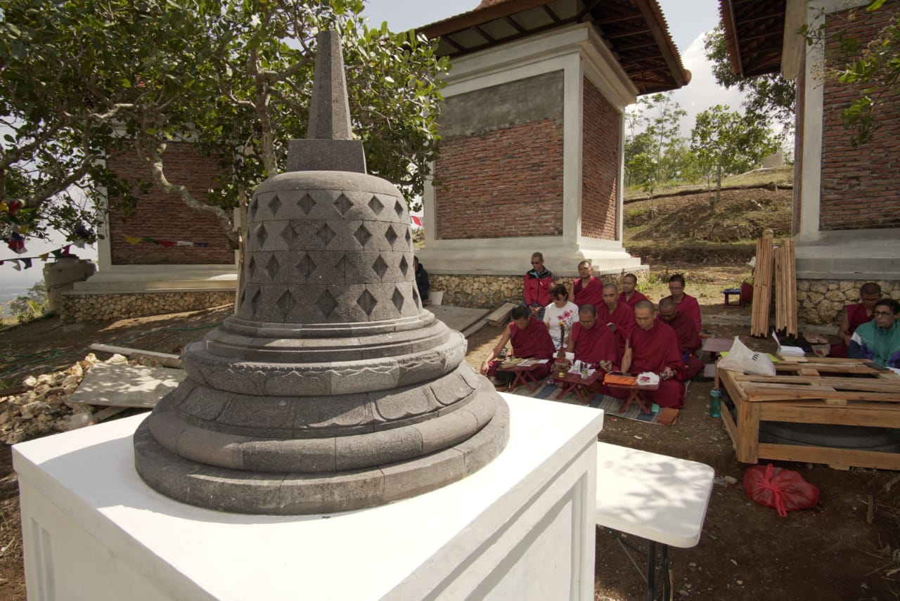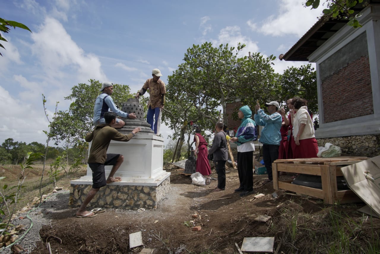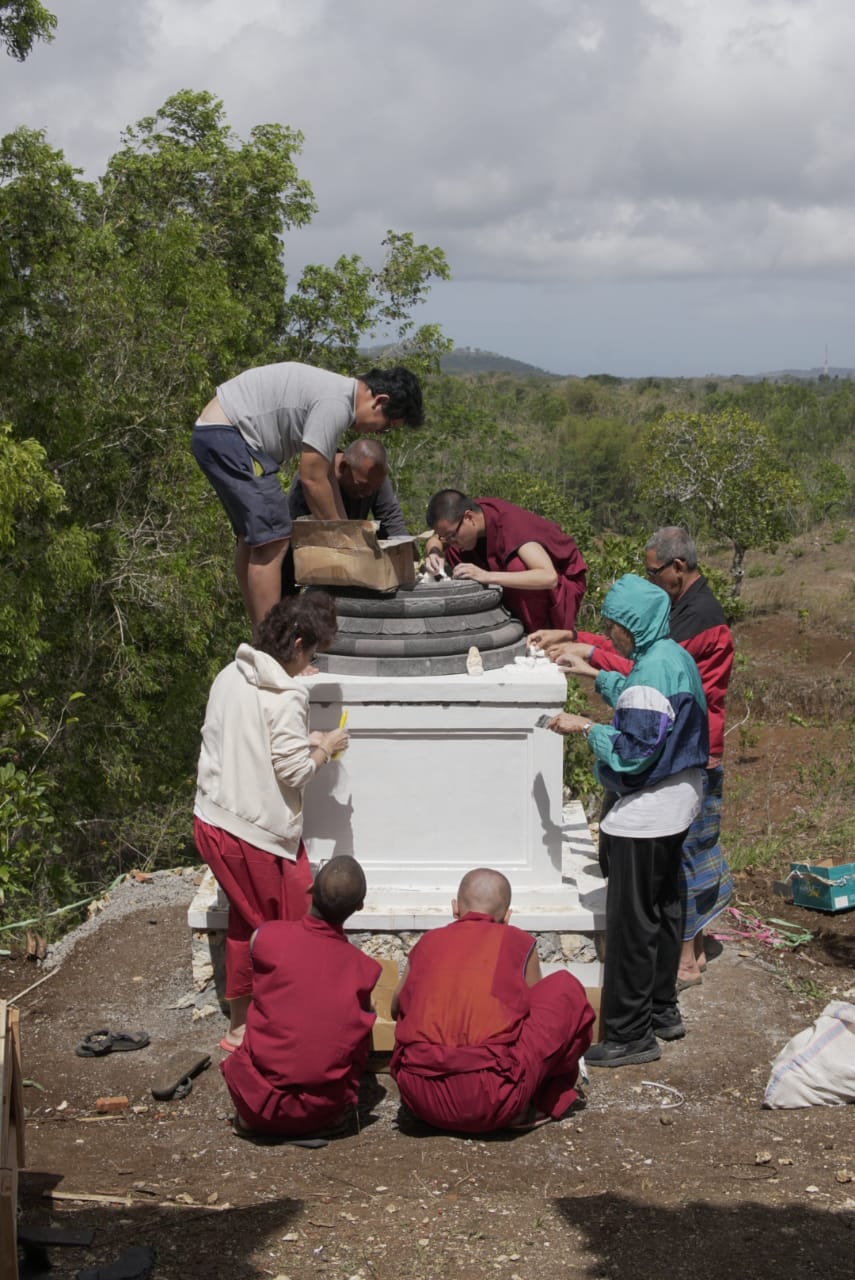 The next year, in 1990, Rinpoche visited Singapore and Malaysia. In Malaysia, Rinpoche met Madame Sylvia Tjakra and in the later years the Dharma Center KTCL was established. On August 3 and 4, at the site of the Indonesia Gaden Syeydrub Nampar Gyelwei Ling, Madame Sylvia’s daughter, Madame Irene Hartanto conducted the ritual for a commemorative stupa for Madame Sylvia. The stupa was of the Borobudur style. After the contents of the Stupe were put inside, a consecration ritual was done by Madame Irene Hartanto, together with the monastic Sangha members of Kadam Choeling Indonesia. The commemorative stupa was dedicated for Madame Sylvia Tjakra (Omah). May the virtue generated from Madame Sylvia’s virtuous activities for the dharma and the spiritual master during her active years create the condition for her to be able to return again and again in good condition, whereby she could meet with the spiritual master and the virtuous community, in order to continue the dharma practice until the attainment of perfect Enlightenment.