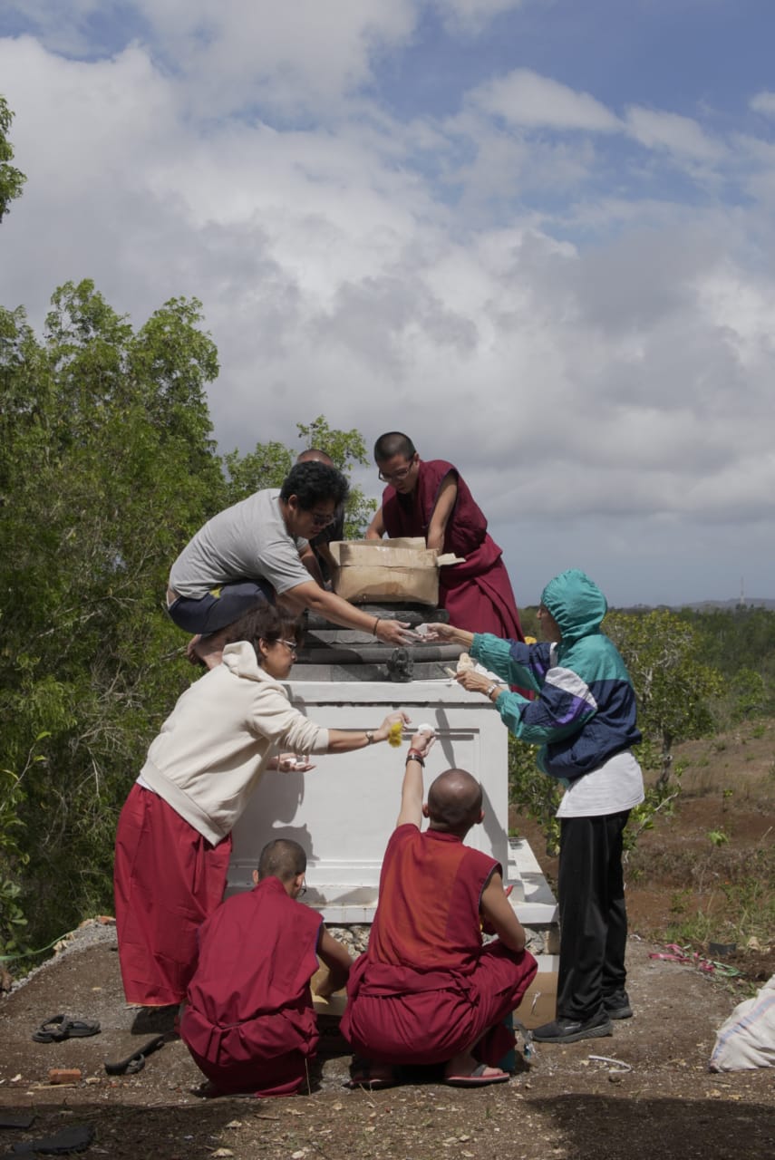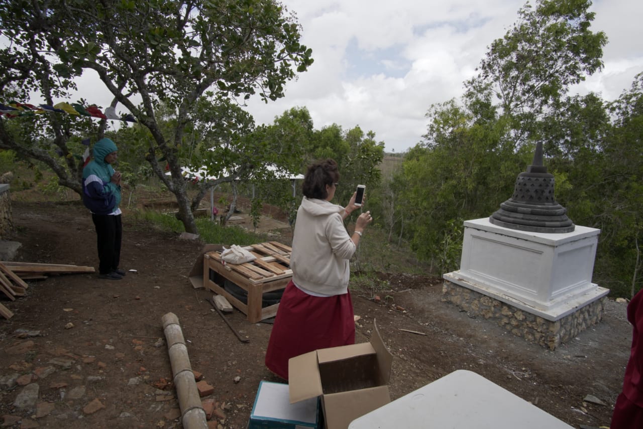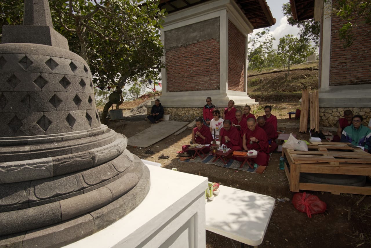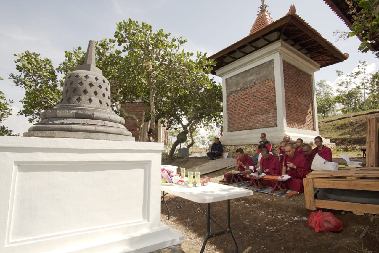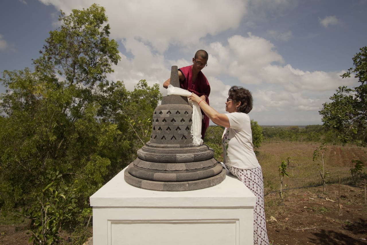 The next year, in 1990, Rinpoche visited Singapore and Malaysia. In Malaysia, Rinpoche met Madame Sylvia Tjakra and in the later years the Dharma Center KTCL was established. On August 3 and 4, at the site of the Indonesia Gaden Syeydrub Nampar Gyelwei Ling, Madame Sylvia’s daughter, Madame Irene Hartanto conducted the ritual for a commemorative stupa for Madame Sylvia. The stupa was of the Borobudur style. After the contents of the Stupe were put inside, a consecration ritual was done by Madame Irene Hartanto, together with the monastic Sangha members of Kadam Choeling Indonesia. The commemorative stupa was dedicated for Madame Sylvia Tjakra (Omah). May the virtue generated from Madame Sylvia’s virtuous activities for the dharma and the spiritual master during her active years create the condition for her to be able to return again and again in good condition, whereby she could meet with the spiritual master and the virtuous community, in order to continue the dharma practice until the attainment of perfect Enlightenment.