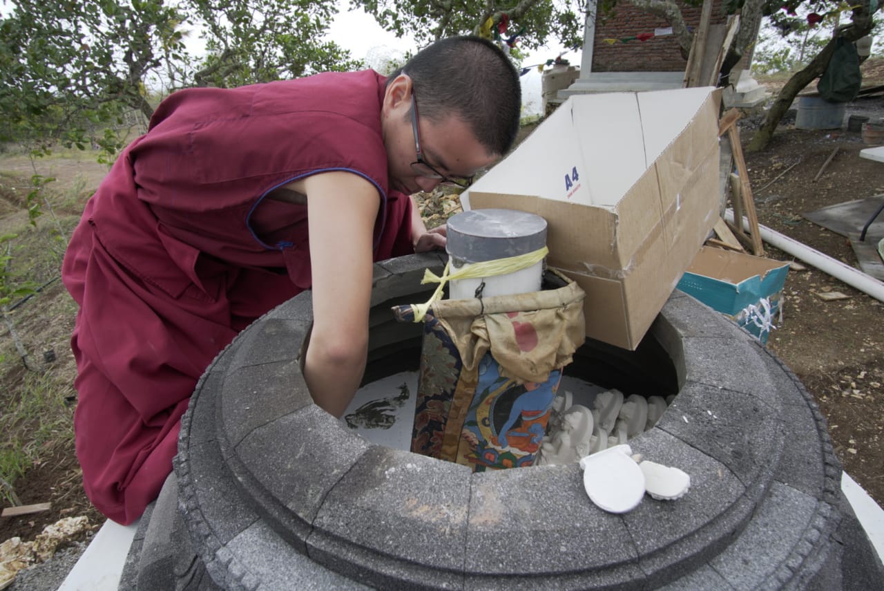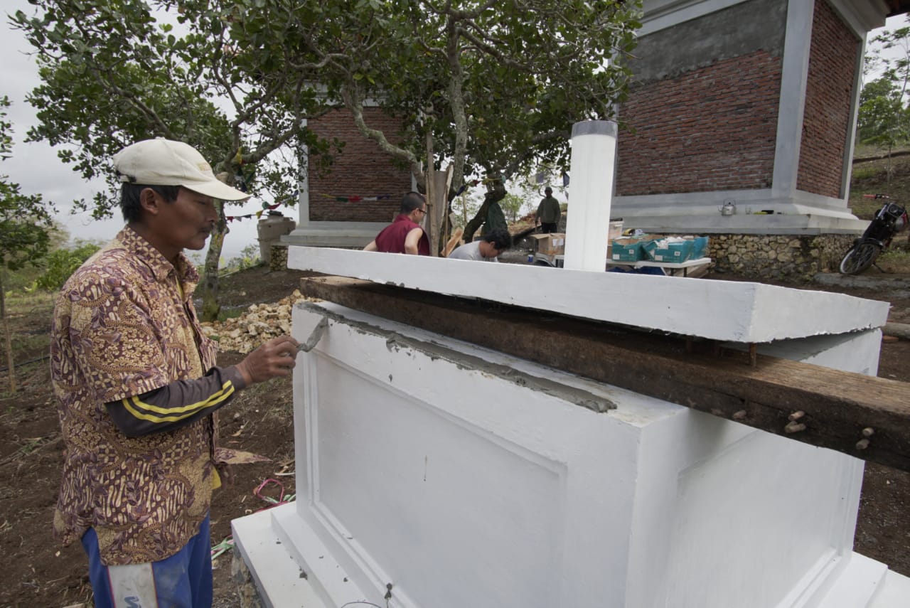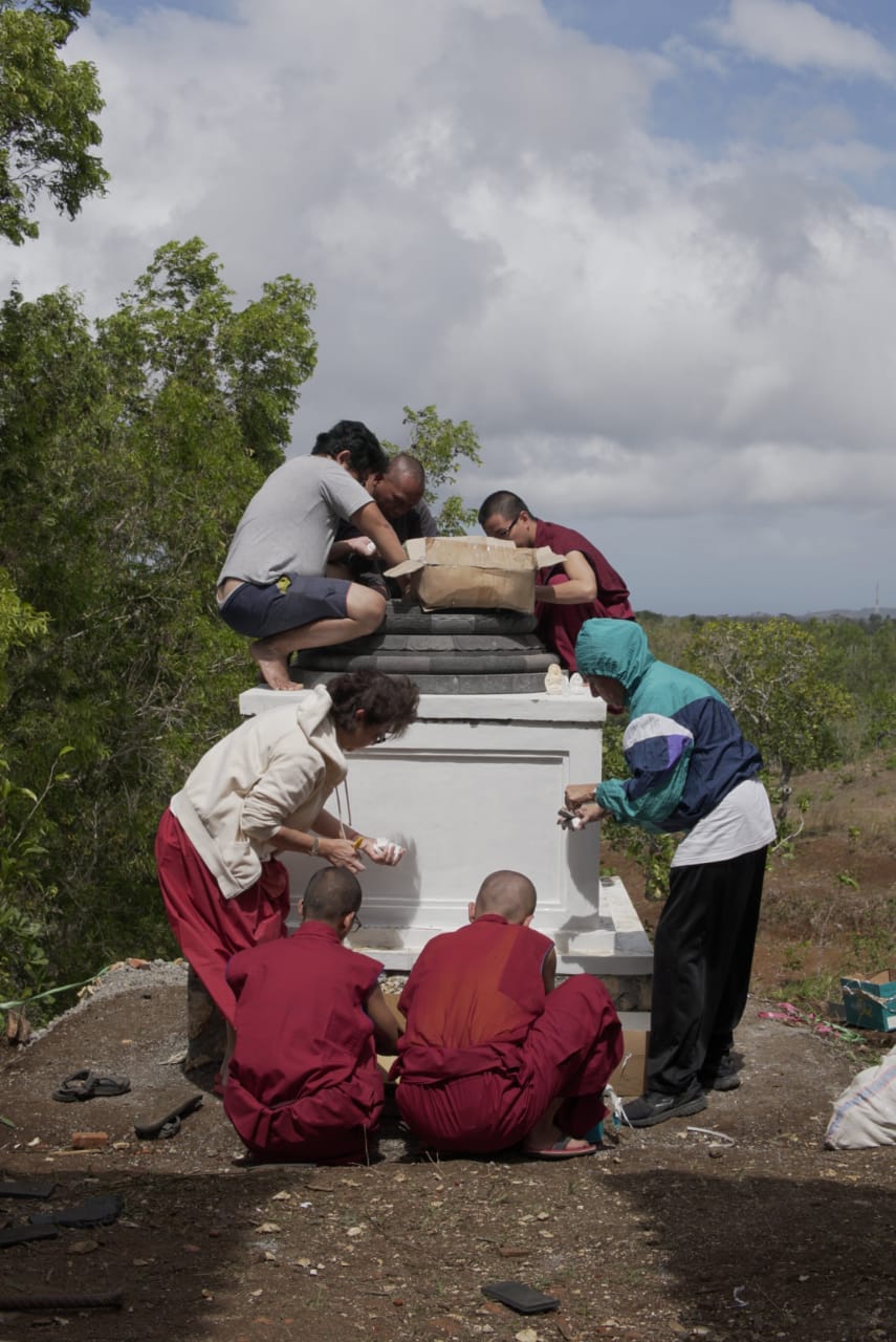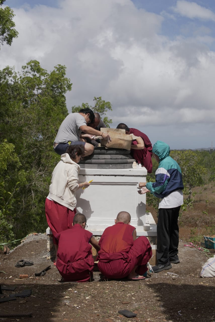 The next year, in 1990, Rinpoche visited Singapore and Malaysia. In Malaysia, Rinpoche met Madame Sylvia Tjakra and in the later years the Dharma Center KTCL was established. On August 3 and 4, at the site of the Indonesia Gaden Syeydrub Nampar Gyelwei Ling, Madame Sylvia’s daughter, Madame Irene Hartanto conducted the ritual for a commemorative stupa for Madame Sylvia. The stupa was of the Borobudur style. After the contents of the Stupe were put inside, a consecration ritual was done by Madame Irene Hartanto, together with the monastic Sangha members of Kadam Choeling Indonesia. The commemorative stupa was dedicated for Madame Sylvia Tjakra (Omah). May the virtue generated from Madame Sylvia’s virtuous activities for the dharma and the spiritual master during her active years create the condition for her to be able to return again and again in good condition, whereby she could meet with the spiritual master and the virtuous community, in order to continue the dharma practice until the attainment of perfect Enlightenment.
