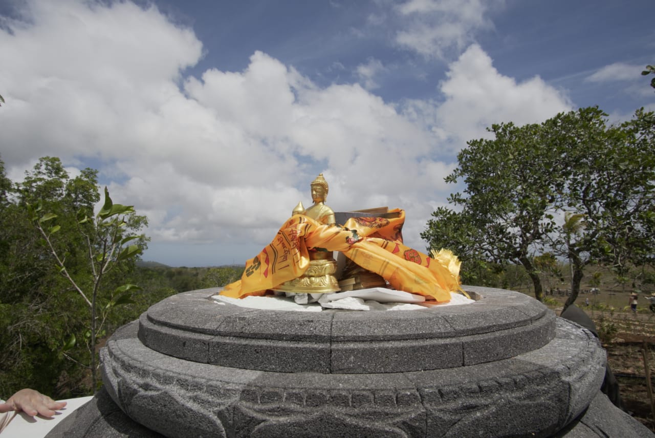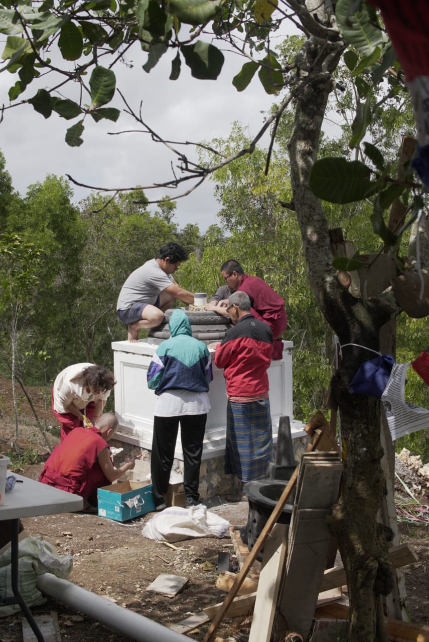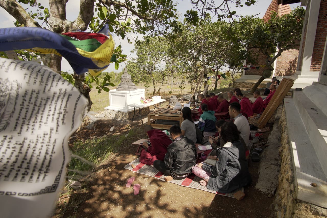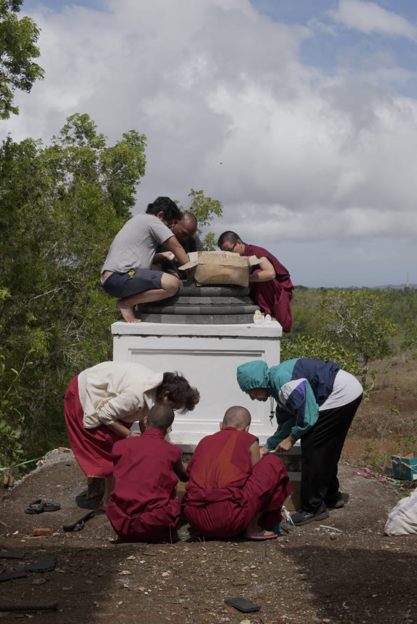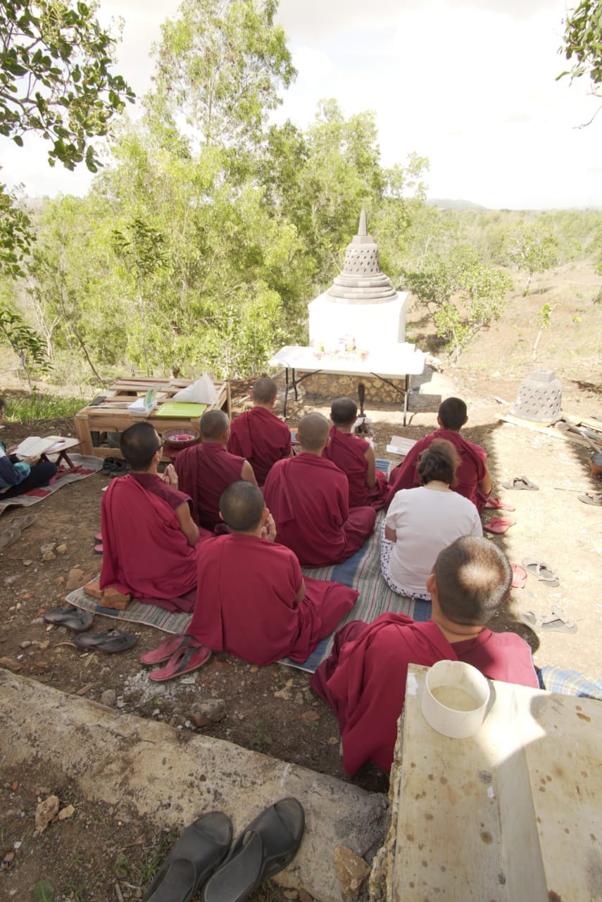The next year, in 1990, Rinpoche visited Singapore and Malaysia. In Malaysia, Rinpoche met Madame Sylvia Tjakra and in the later years the Dharma Center KTCL was established. On August 3 and 4, at the site of the Indonesia Gaden Syeydrub Nampar Gyelwei Ling, Madame Sylvia’s daughter, Madame Irene Hartanto conducted the ritual for a commemorative stupa for Madame Sylvia. The stupa was of the Borobudur style. After the contents of the Stupe were put inside, a consecration ritual was done by Madame Irene Hartanto, together with the monastic Sangha members of Kadam Choeling Indonesia. The commemorative stupa was dedicated for Madame Sylvia Tjakra (Omah). May the virtue generated from Madame Sylvia’s virtuous activities for the dharma and the spiritual master during her active years create the condition for her to be able to return again and again in good condition, whereby she could meet with the spiritual master and the virtuous community, in order to continue the dharma practice until the attainment of perfect Enlightenment.