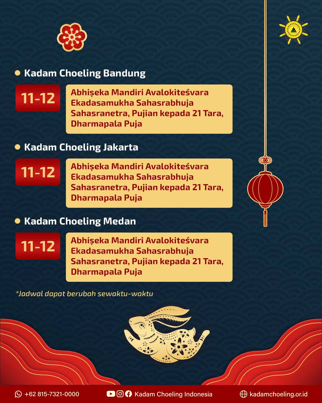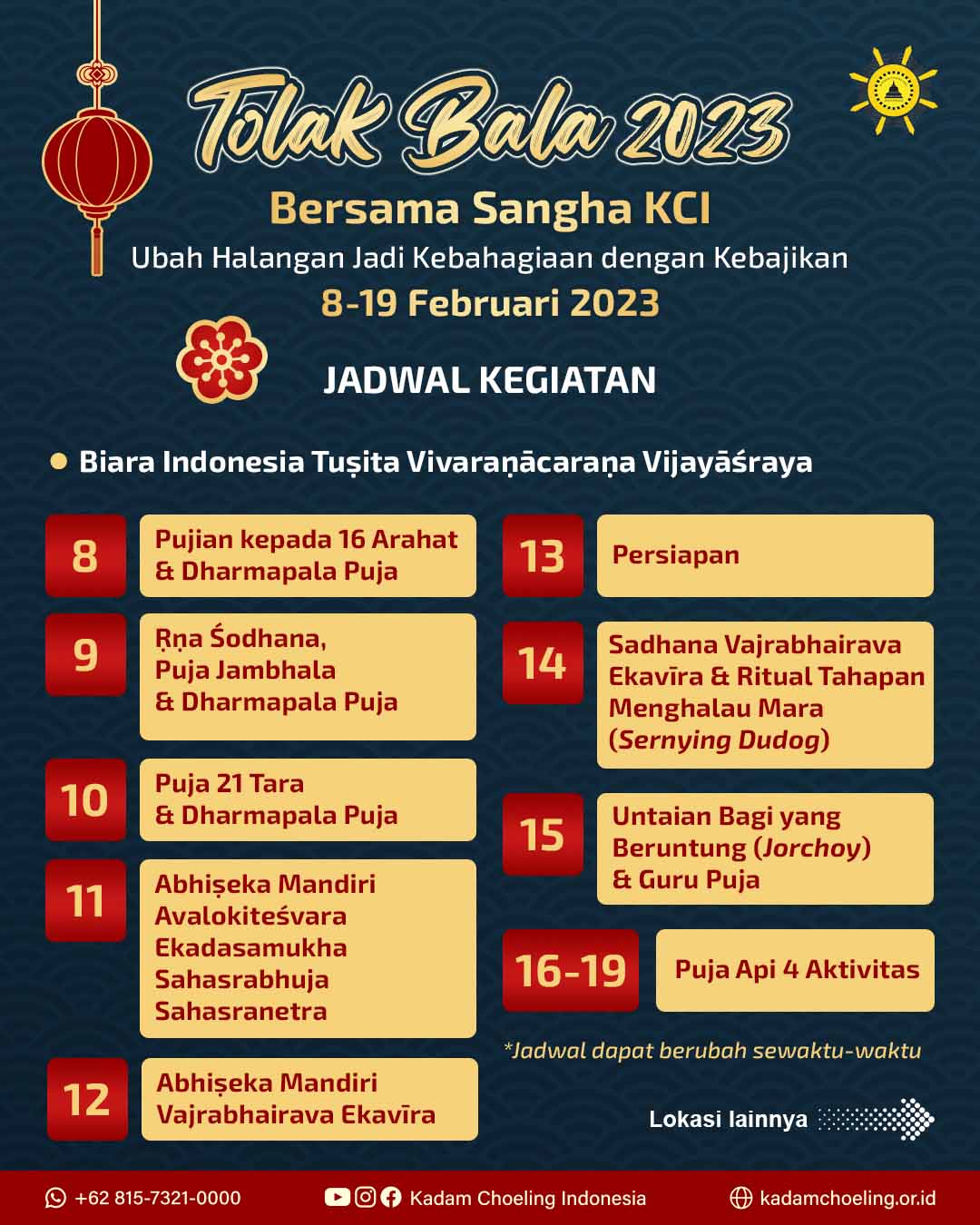 Kabar terbaru seputar Tolak Bala KCI 2023 dan aktivitas pusat Dharma KCI lainnya akan dikabarkan di Instagram dan Facebook Kadam Choeling Indonesia.