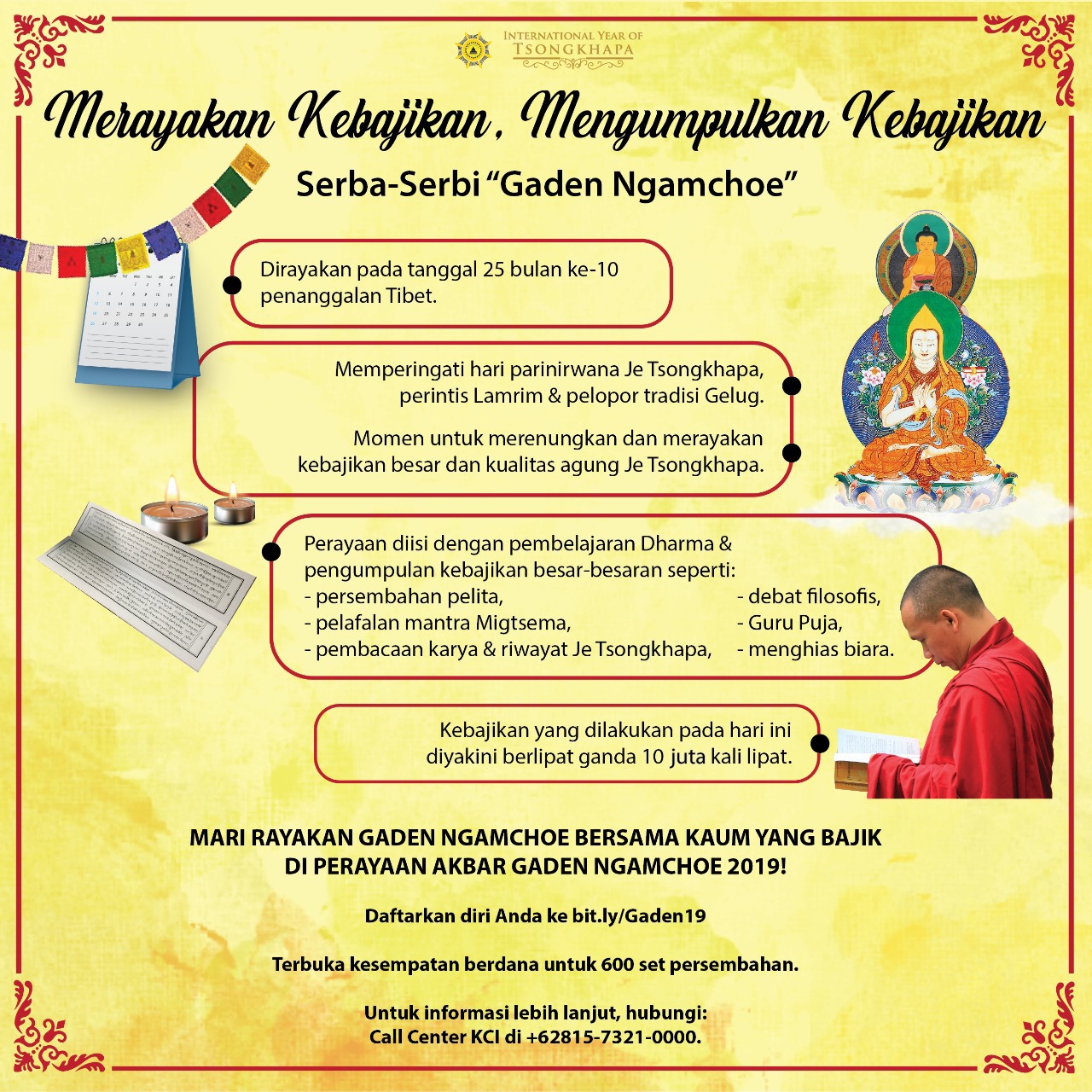 Di Indonesia, Kadam Choeling Indonesia juga rutin merayakan Gaden Ngamchoe setiap tahun dengan beragam pengumpulan kebajikan di berbagai kota. Tahun ini, bertepatan dengan International Year of Tsongkhapa, KCI mengajak seluruh umat Buddha di Indonesia untuk mengumpulkan kebajikan bersama di Perayaan Akbar Gaden Ngamchoe yang akan diselenggarakan pada tanggal 21-24 Desember 2019 di Gedung Prasadha Jinarakkhita, Jakarta Barat. Dalam acara ini, total 3000 set persembahan akan dipersembahkan kepada guru spiritual, Triratna, istadewata, pelindung Dharma. Ada juga beragam praktik pengumpulan kebajikan seperti Praktik Bersama Guru Yoga Pujian Dewa-Dewi Tushita (Gaden Lha Gyama), pengumpulan mantra Migtsema, pelafalan karya-karya agung Je Tsongkhapa seperti autobiografi Garis Hidup yang Terpenuhi, Tiga Aspek Sang Jalan, Nyanyian Baris-Baris Pengalaman, dan sebagainya, persembahan Ganacakra dan Guru Puja, konsekrasi 2000 Patung Je Tsongkhapa, Agnihotra Yajñā, dan doa-doa dedikasi (Monlam). Selain untuk merayakan Gaden Ngamchoe, seluruh kebajikan yang terkumpul juga didedikasikan untuk kesehatan dan umur panjang Guru Dagpo Rinpoche, Sang Ayahanda Laksana Mentari Dharma yang mempertemukan kita dengan ajaran Je Tsongkhapa.