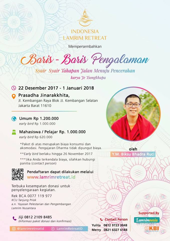 Kesempatan yang sangat luar biasa di mana pada tahun 2017 ini akan diselenggarakan Indonesia Lamrim Retreat. Kegiatan ini terdiri dari sesi pembabaran Dharma dan penyunyian yang diadakan selama 9 hari.