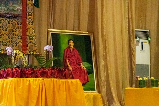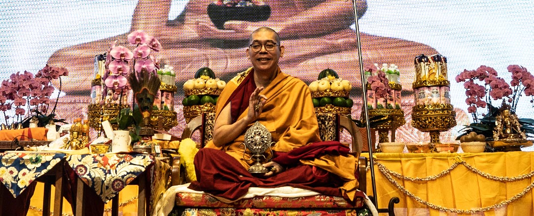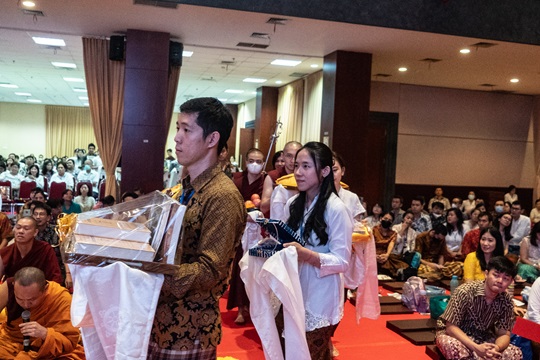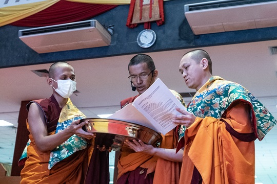 Persembahan mandala umur panjang untuk Y.M. Suhu Bhadra Ruci yang diwakilkan oleh Y.M. Tenzin Chograb, Y.M Tenzin Tringyal, dan Y.M. Yonten Gyatso.