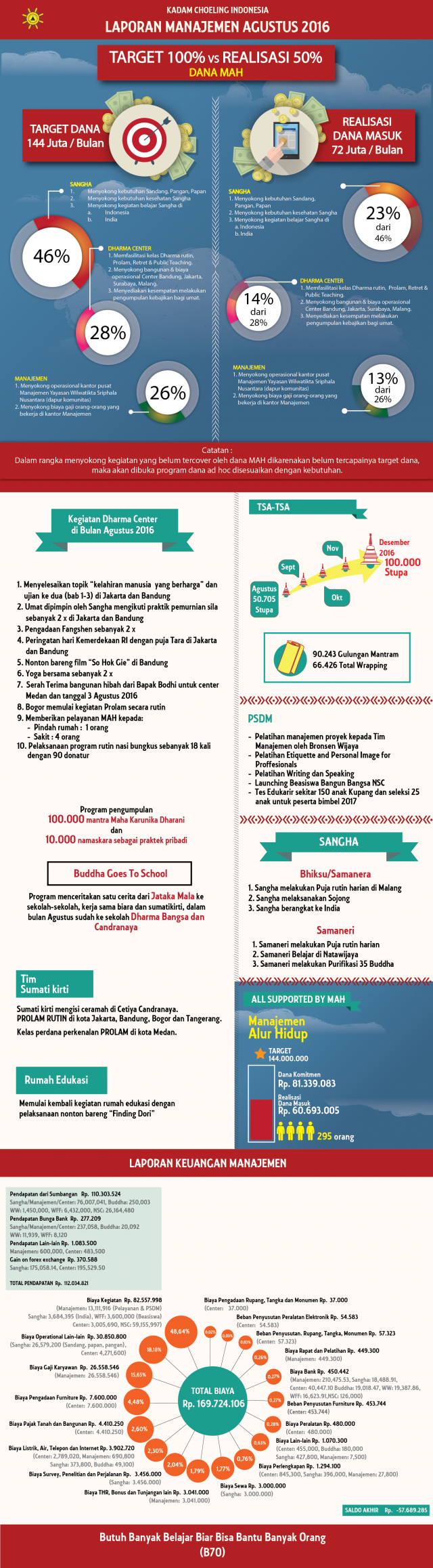Kadam Choeling Indonesia (KCI) selaku komunitas Lamrim yang saling menjaga kembali meluncurkan Laporan Bulanan dalam format infografis edisi Agustus 2016. Dengan hati terbuka yang dipenuhi kehangatan, marilah kita bersukacita dan bersemangat dalam kebajikan. Bila Anda memiliki pertanyaan atau tanggapan terhadap infografis Laporan Bulanan KCI, sampaikan kepada Call Center KCI di 081573210000. Terima kasih.