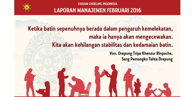 Kadam Choeling Indonesia (KCI) selaku komunitas Lamrim yang saling menjaga kembali meluncurkan Laporan Bulanan dalam format infografis edisi Februari 2016. Dengan hati terbuka yang dipenuhi kehangatan, marilah kita bersukacita dan bersemangat dalam kebajikan. Bila Anda memiliki pertanyaan atau tanggapan terhadap infografis Laporan Bulanan KCI, sampaikan kepada Call Center KCI di 081573210000. Terima kasih.