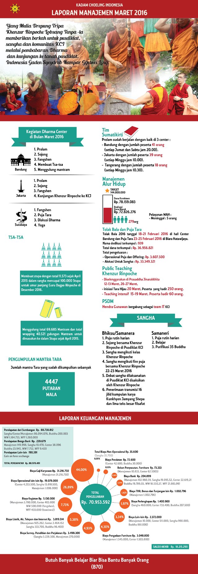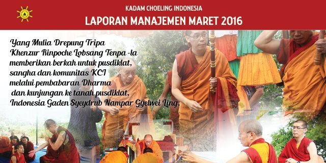 Di bulan Maret 2016 kita semua mendapatkan berkah yang luar biasa besar dan berharga dari YM Drepung Tripa Khenzur Rinpoche Lobsang Tenpa-la berupa sesi ajaran dan Inisiasi di Jakarta serta kunjungan beliau ke tanah Pusdiklat KCI di Malang serta rangkaian acara lainnya. Semoga berkah ini senantiasa menemani kita dalam menapaki jalan menuju pencerahan.