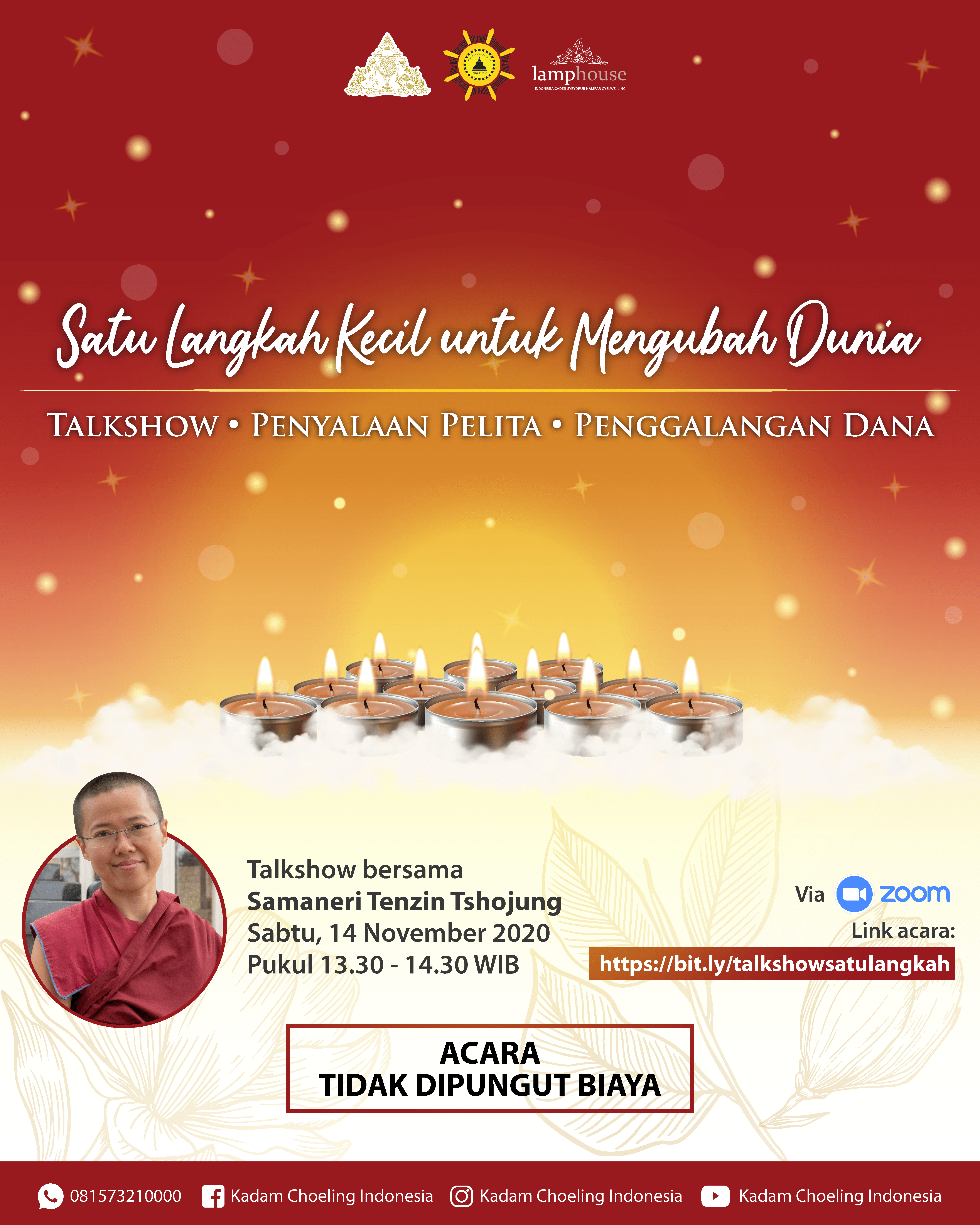 Sabtu (14/11), Kadam Choeling Indonesia menyelenggarakan talkshow “Satu Langkah Kecil untukMengubah Dunia” bersama Samaneri Tenzin Tshojung. Beliau adalah samaneri pertama di Indonesia yang menempuh pendidikan filsafat Buddhis berdasarkan tradisi Nalanda. Tak kurang dari tiga puluh kitab Dharma yang berbahasa Tibet telah diterjemahkan oleh Beliau. Samaneri Tenzin Tshojung juga pernah menjadi penerjemah lisan bagi banyak guru besar seperti Y.M.S Dalai Lama XIV dan Dagpo Rinpoche.