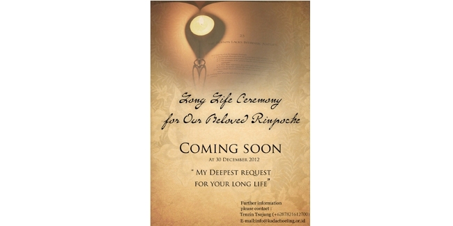BANDUNG, KADAM CHOELING NEWS – Memasuki H Min 11 Transmisi teks “Pembebasan di Tangan Kita” yang akan dibuka pada malam tanggal 22 Desember 2012, Panitia Long Life hendak mengabarkan bahwa pada tanggal 30 Desember, bertepatan dengan Ritual Pembangkitan Bodhicitta (Bodhicitta Ceremony), sekaligus diadakan Ritual Permohonan Umur Panjang yang ditujukan kepada Yang Mulia Dagpo Lama Rinpoche. Upacara Umur Panjang ini bisa diikuti oleh segenap peserta Retret karena merupakan rangkaian dari program Dharma & Retret itu sendiri. Bagi yang hendak bertanya bisa langsung mengajukan pertanyaan pada kolom “COMMENT” di bawah artikel ini. (C. Jayawardhani)