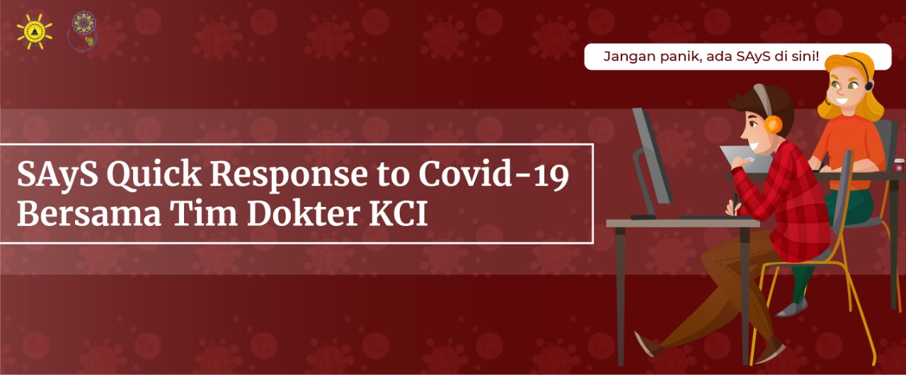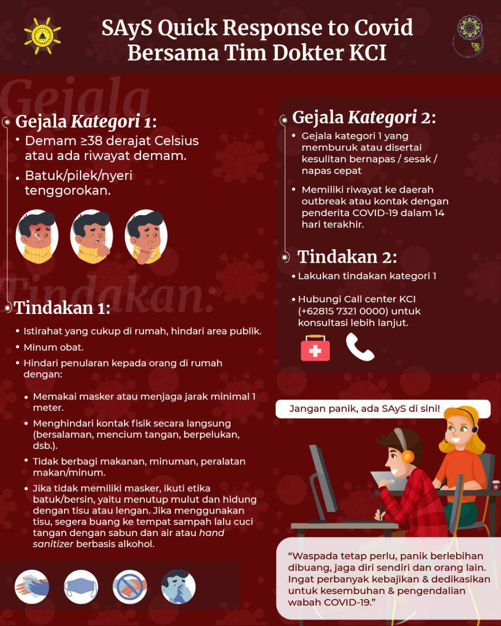 SAyS bekerja sama dengan tim dokter KCI mengeluarkan panduan untuk yang merasa tidak sehat. Jika memang merasa ada gejala pada kategori 2 seperti yang tercantum di poster, segera hubungi Call Center KCI. Kami akan langsung menghubungkan dengan Tim Dokter KCI yang dibentuk khusus untuk membantu keluarga besar kita melewati masa-masa ini.
