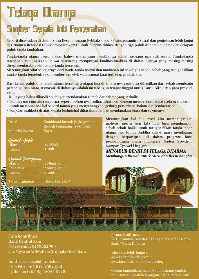 Mari dukung program pembangunan kuti ini yang juga sekaligus merupakan program menjaga kelestarian Ratna Sangha yang pada gilirannya merupakan sebuah elemen penting di dalam kelestarian dan keutuhan Triratna di muka bumi ini.