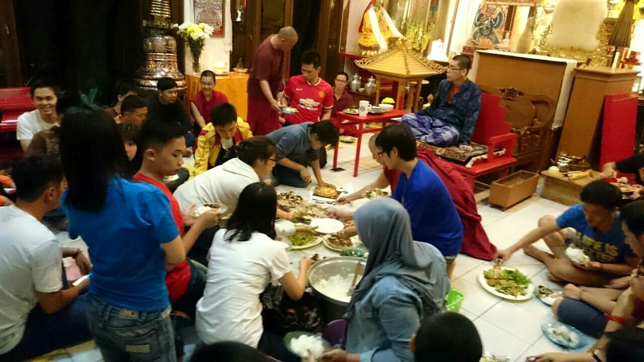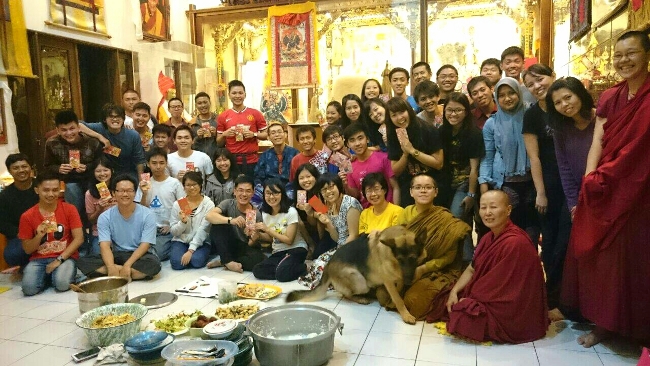 Kita akan melewati tahun kuda dan lusa sudah masuk tahun kambing. Siapa  di sini yang shio kambing? Aku punya daftar ciong. Shio babi ciong gokui, shio kelinci ciong pekho, shio ular ciong phi kou, misalnya ditangkap polisi karena ga bawa helm, shio kambing kerbau ciong besar. Besok malam kita akan Puja Tara di sini. Nata juga Puja Tara. Mari kita lewati tahun ini dengan baik.