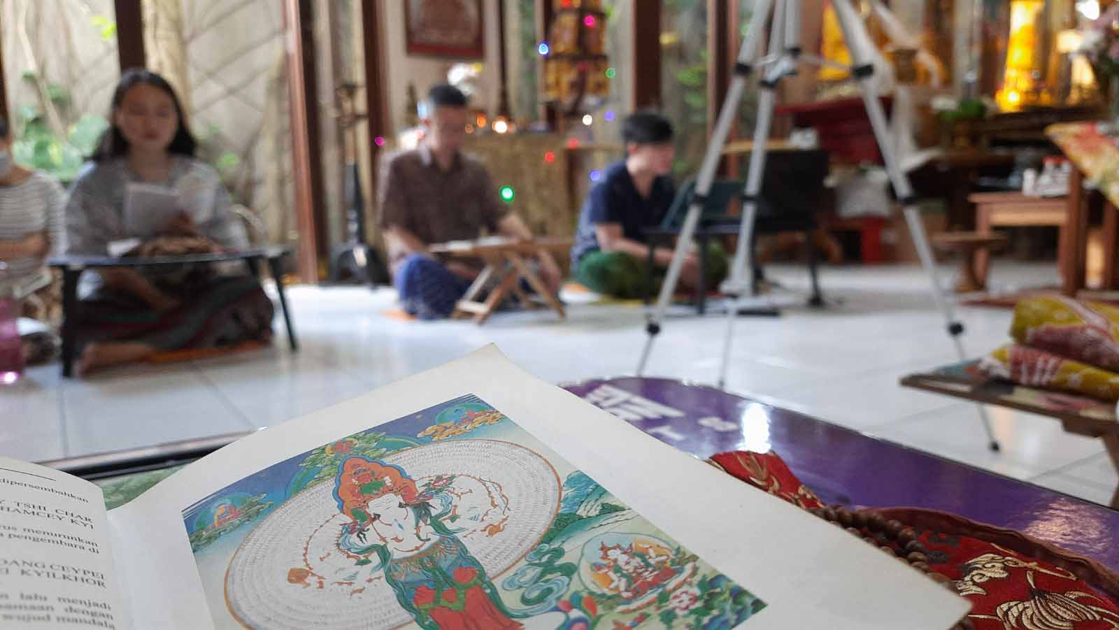 Puja Sadhana Avalokiteśvara Ekadasamukha Sahasrabhuja Sahasranetra tersebut dilaksanakan secara luring di Hall Istana Payung Perak Kadam Choeling Bandung dan secara daring melalui Zoom. Kegiatan bajik kolektif ini dimulai pukul 07.30 dan ditutup dengan pelafalan 21 Mantra Mani hingga pukul 09.15 WIB.
