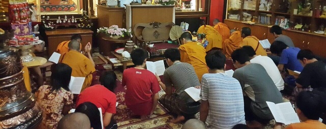 “Hari ini adalah peringatan Buddha menaklukkan enam guru Hindu. Peristiwa penting yang diyakini oleh kaum Mahayana bahwa kebajikan akan berlipat seratus ribu kali lipat. Maka hari ini setidaknya berbuat satu kebajikan kecil pada guru dan Triratna dan semua makhluk. Agar kita semua memiliki benih kebajikan yang menjadi sebab kebahagiaan kita semua.