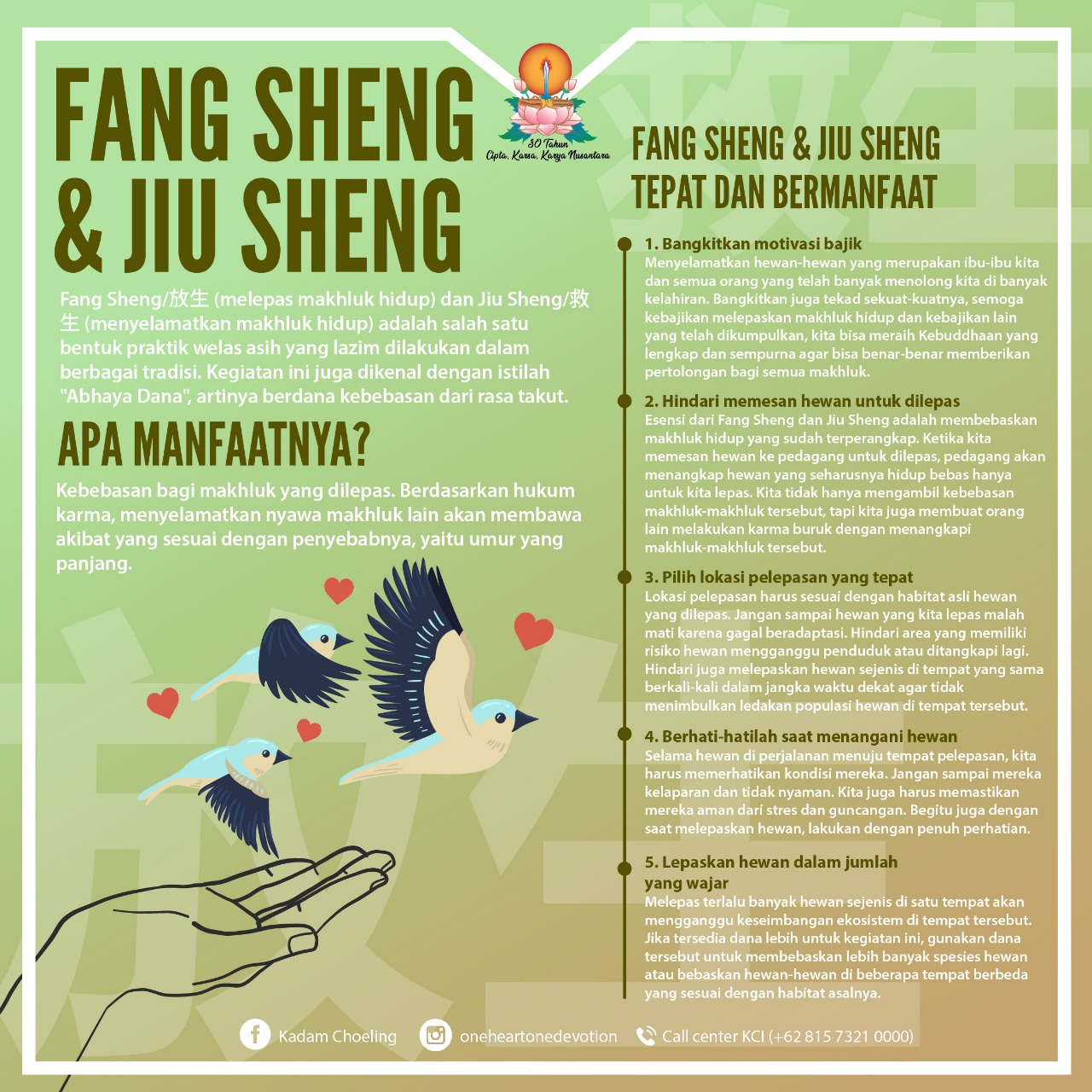 Fang Sheng/放生 (melepas makhluk hidup) dan Jiu Sheng/救生 (menyelamatkan makhluk hidup) adalah salah satu bentuk praktik welas asih yang lazim dilakukan dalam berbagai tradisi Buddhis baik secara rutin maupun di hari-hari khusus. Orang-orang akan membeli hewan-hewan yang terperangkap di sangkar pedagang dan melepaskan hewan tersebut ke alam liar. Kegiatan Fang Sheng dan Jiu Sheng ini juga dikenal dengan istilah “Abhaya Dana”, artinya berdana kebebasan dari rasa takut. Sesuai dengan namanya, ketika kita melakukan Fang Sheng dan Jiu Sheng, kita melepaskan hewan-hewan yang terperangkap dan terancam sehingga mereka bisa kembali hidup bebas di habitat asalnya. Tidak hanya menolong satu makhluk hidup yang kita lepaskan, kita juga bisa turut mengembalikan keseimbangan ekosistem dengan mengembalikan hewan ke habitat asal yang sesuai.