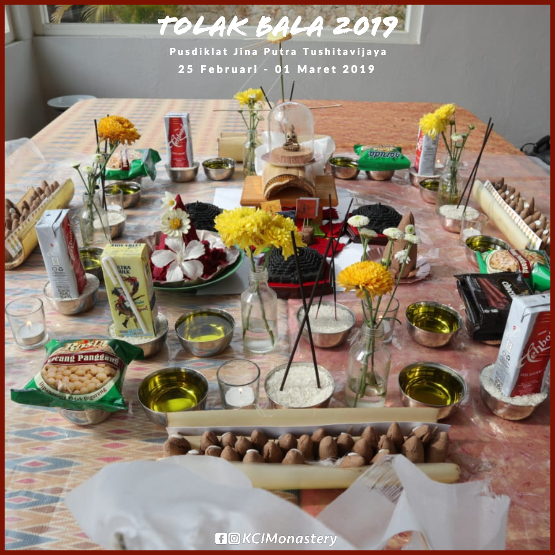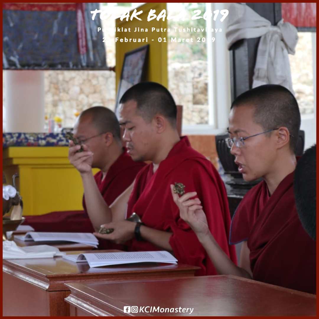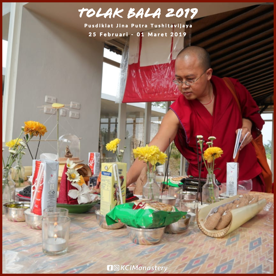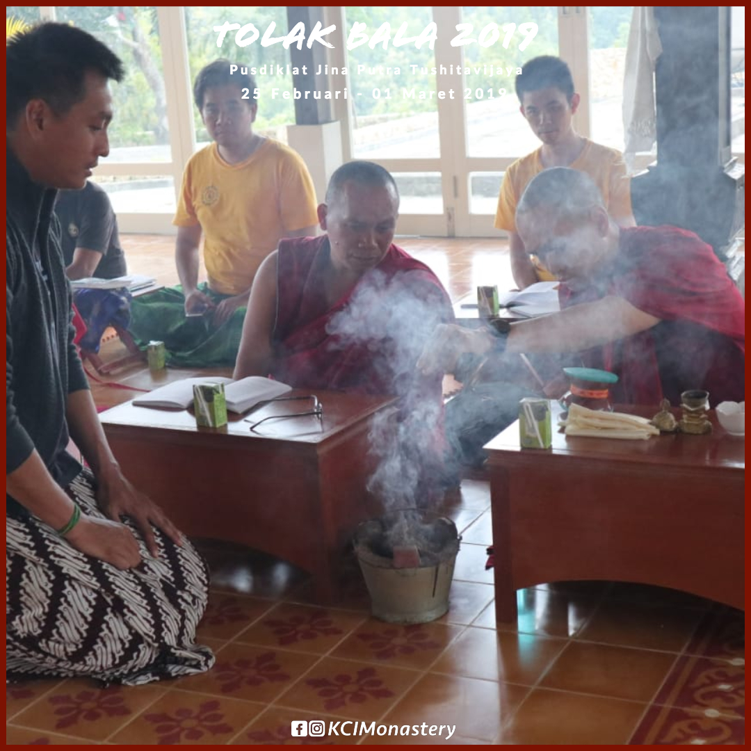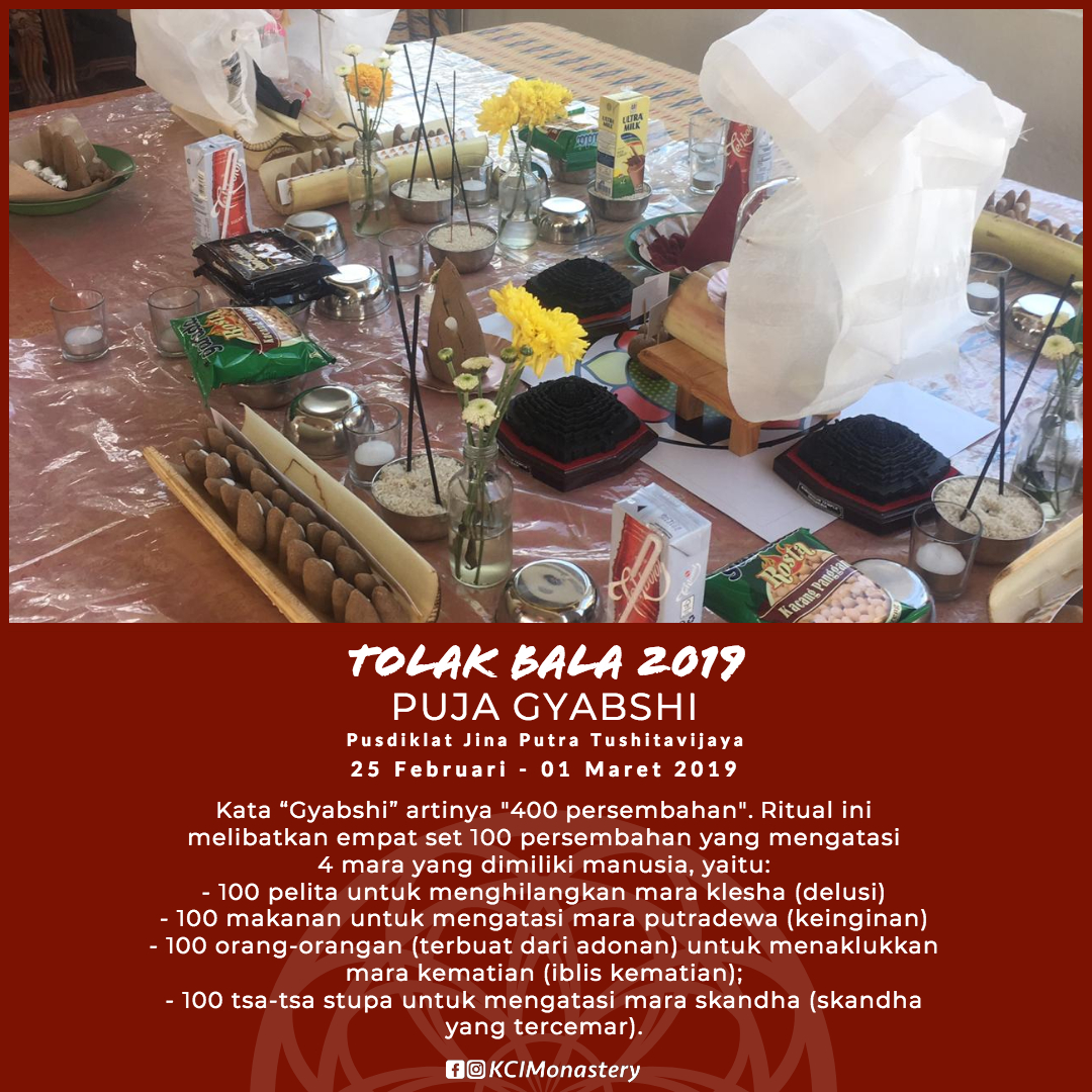 Dalam ritual Tolak Bala di Pusdiklat Jina Putra Tushitavijaya, para Sangha Monastik dan Praktisi Perumah Tangga KCI juga melakukan upacara Gyabshi untuk menghalau berbagai halangan yang akan dihadapi di tahun 2019, serta mendoakan kebahagiaan dan kedamaian semua makhluk khususnya Bangsa Indonesia.