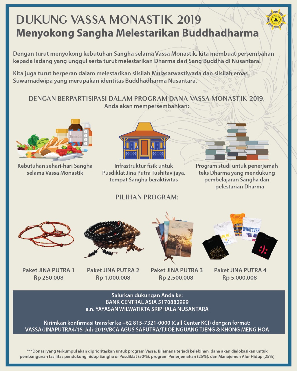 ***Donasi yang terkumpul akan diprioritaskan untuk program Vassa. Bilamana terjadi kelebihan, dana akan dialokasikan untuk pembangunan fasilitas pendukung hidup Sangha di Pusdiklat (50%), program Penerjemahan (25%), dan Manajemen Alur Hidup (25%).